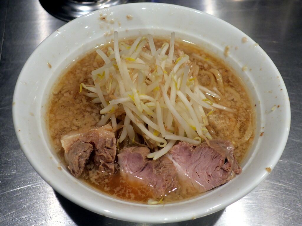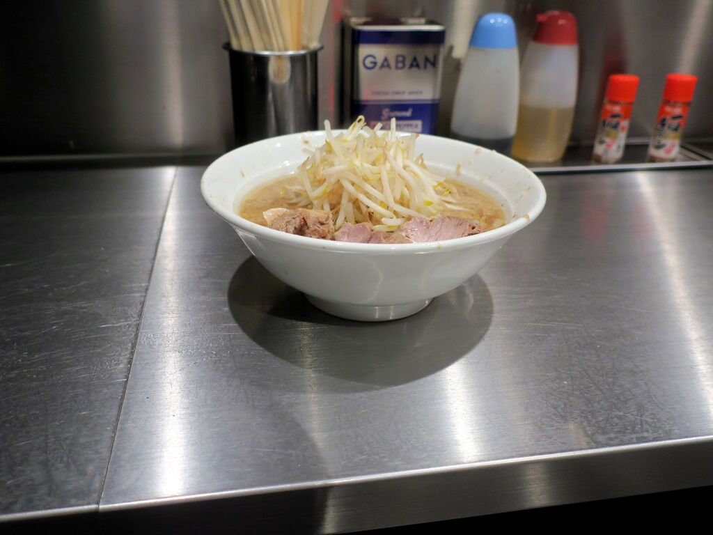 具はブタ、ヤサイ、無料トッピのニンニク少々。麺半分をお願いしたら、「代わりにブタをちょっとだけサービスします」とのことで(ありがとうございます!)、デファの小ラーメンより少しブタ多めかも。