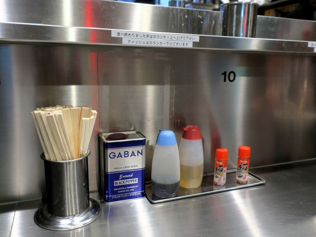 BGMはJ-POP、浅い眠りとか。箸は割り箸。卓上調味料はGABANブラックペッパー、タレ、酢、S&B一味唐辛子。