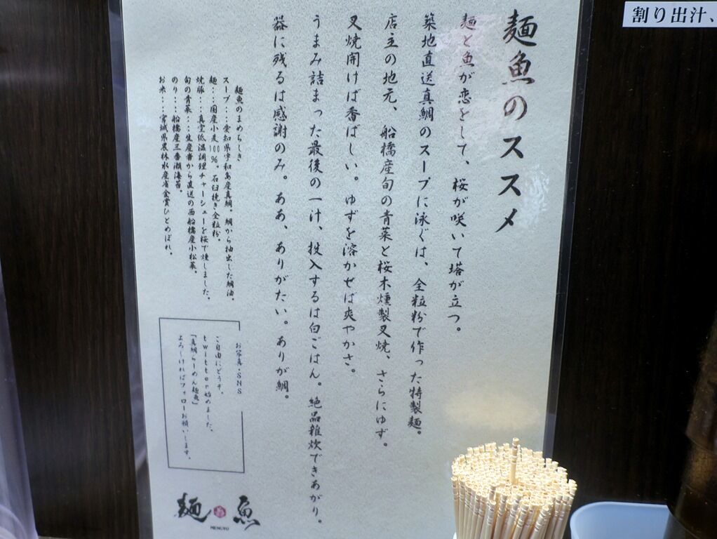 麺魚は2016年1月6日、錦糸町に1号店オープン。2017年4月29日、斜向かいに移転オープン。2018年4月24日、旧本店跡地に満鶏軒オープン。2019年3月16日、錦糸町パルコ店オープン。そして今回4号店オープン。