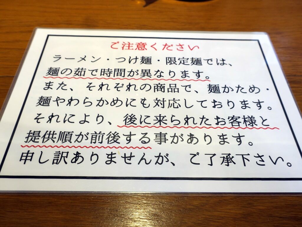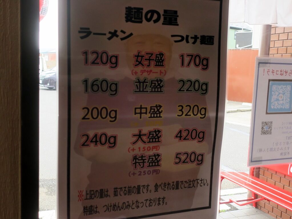 麺量はラーメンが女子盛120g、並盛160g、中盛200g、大盛240g、つけ麺が170g、並盛220g、中盛320g、大盛420g、特盛520g。並盛・中盛同料金。