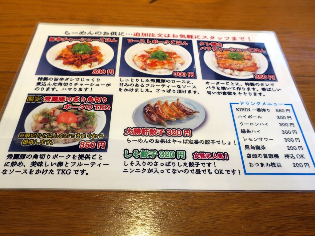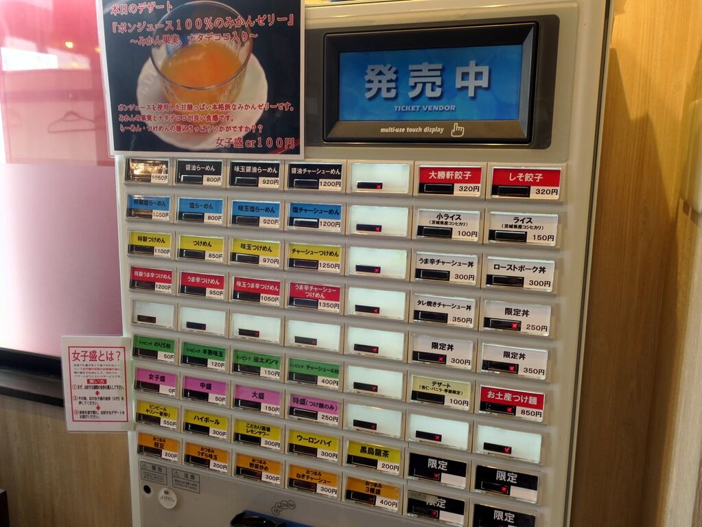 入店するとまず券売機で食券購入です。主なメニューは、醤油らーめん800円、塩らーめん800円、つけめん850円、うま辛つけめん950円、大勝軒餃子320円、しそ餃子320円、女子盛り0円、他。