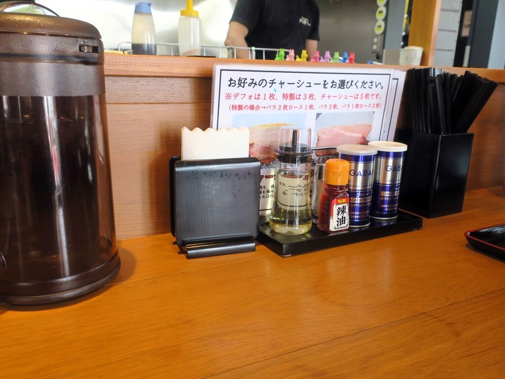 BGMはピアノクラシック。箸は洗い箸でエコ仕様。卓上調味料は酢、S&B辣油、GABANブラックペッパー・ホワイトペッパー。