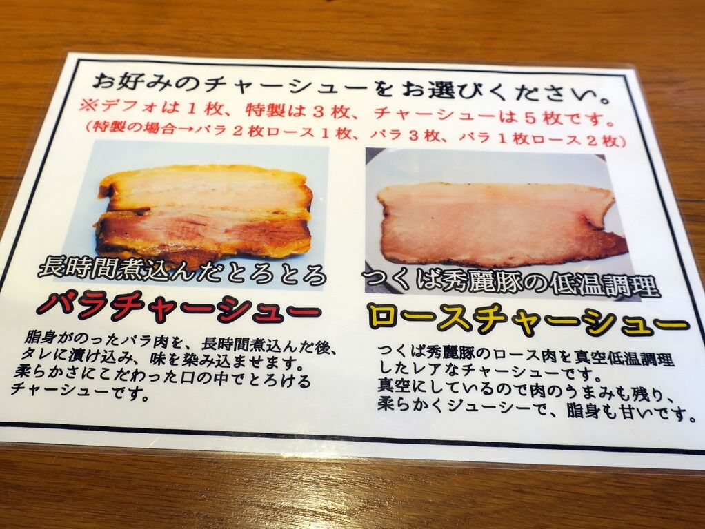 食券を渡すと、チャーシューをバラの煮豚か、つくば秀麗豚のロースを真空低温調理した2種類から1枚選ぶように聞かれます。なお特製は3枚選択、チャーシュー麺は5枚選択。
