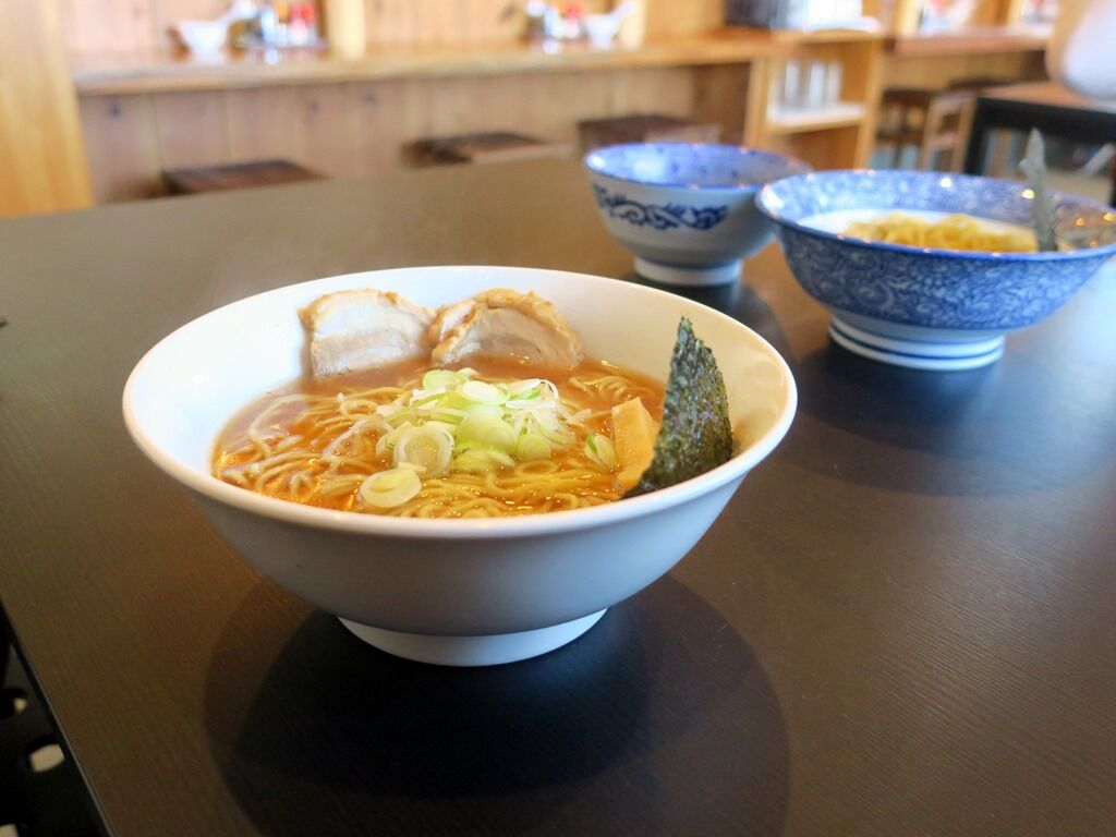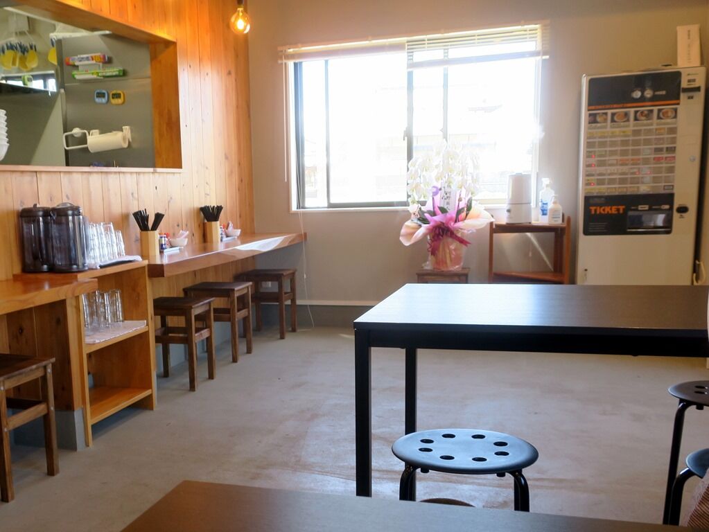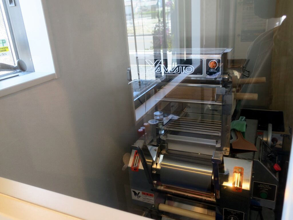 奥にガラス張りの製麺室で中に大和製作所に製麺機が鎮座。スタッフは厨房に店主さんと女将さん?サポートの女性、ホール担当は大女将さん?の3名。他に初日の本日はお父さんと弟さんもヘルプで参戦。