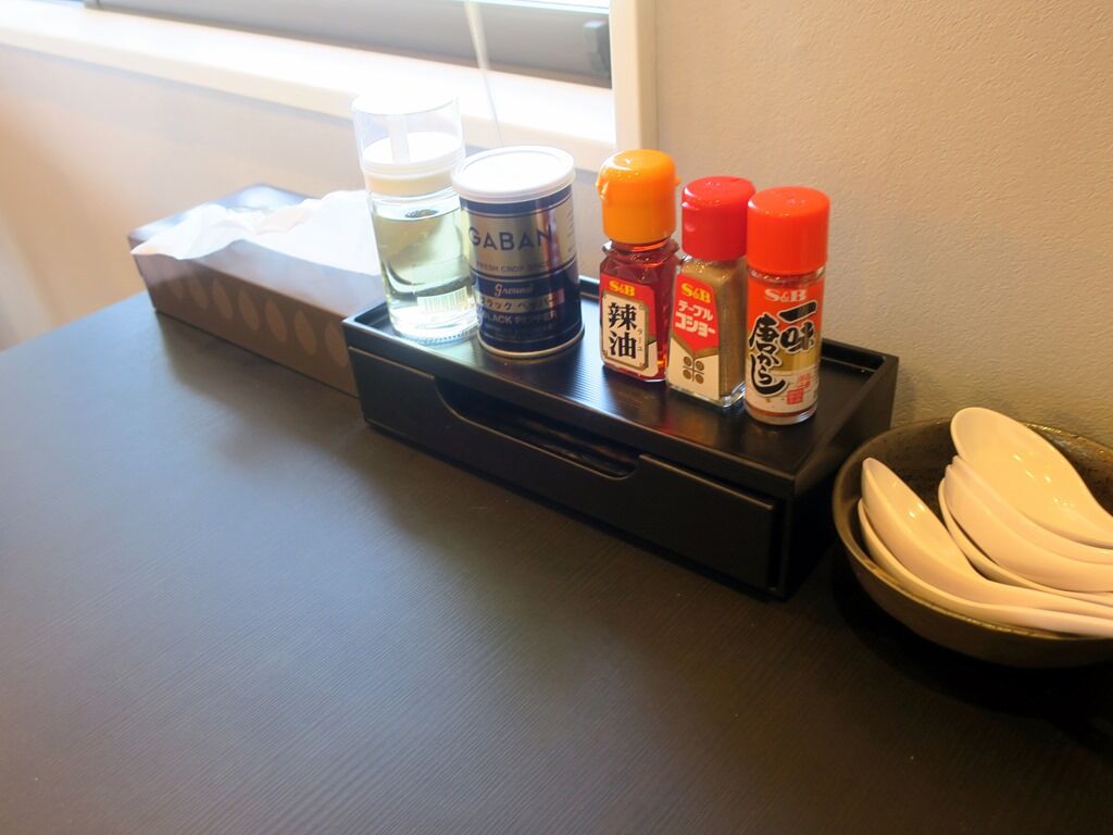 BGMはJ-Pop、SHISHAMOとかあゆとか。箸は洗い箸でエコ仕様。卓上調味料は酢、GABANブラックペッパー、S&B辣油・テーブルコショー・一味唐辛子。