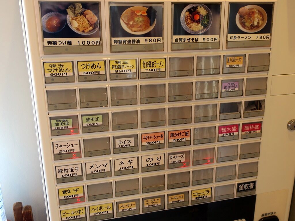 入店するとまず券売機で食券購入です。主なメニューは、つけめん800円、背脂醤油ラーメン790円、台湾まぜそば900円、G系ラーメン780円、G系まぜそば850円、油そば700円、卵かけご飯200円、他。