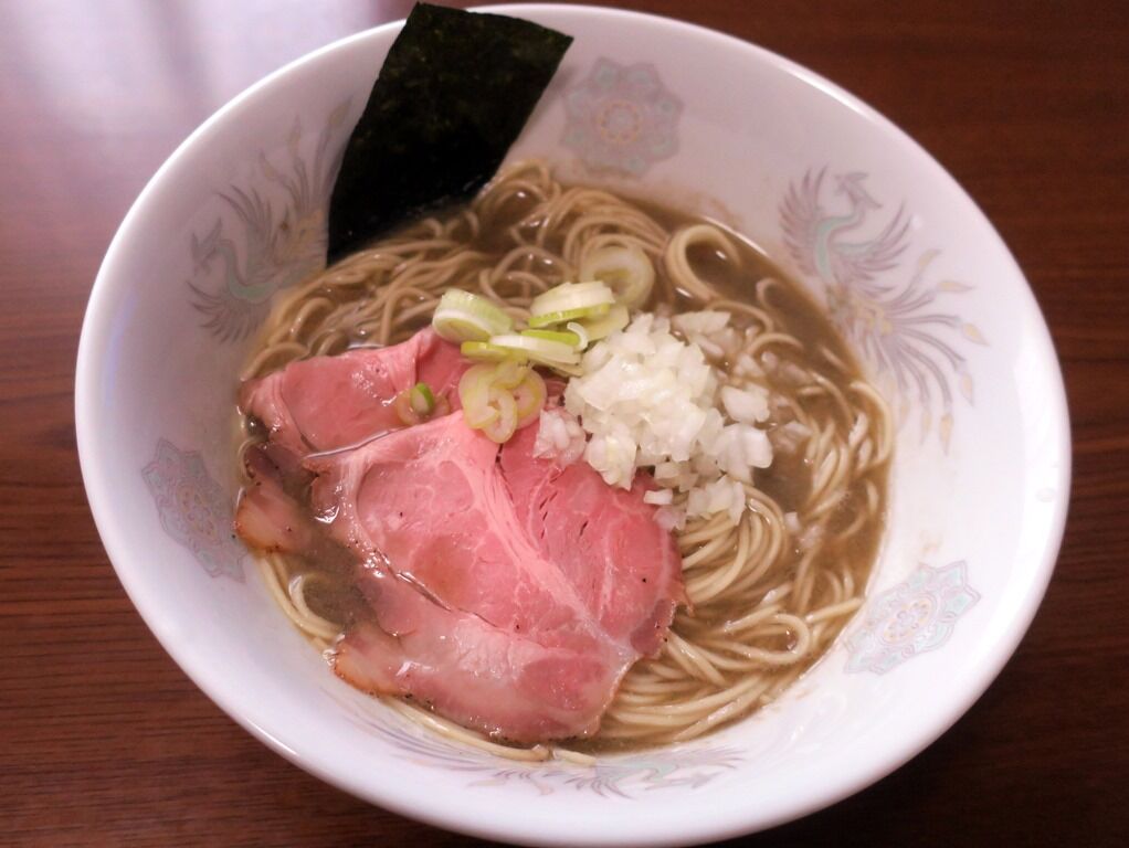 「純煮干しそば」。チャーシュー、メンマ、ねぎ、玉ねぎ、海苔は別途用意。