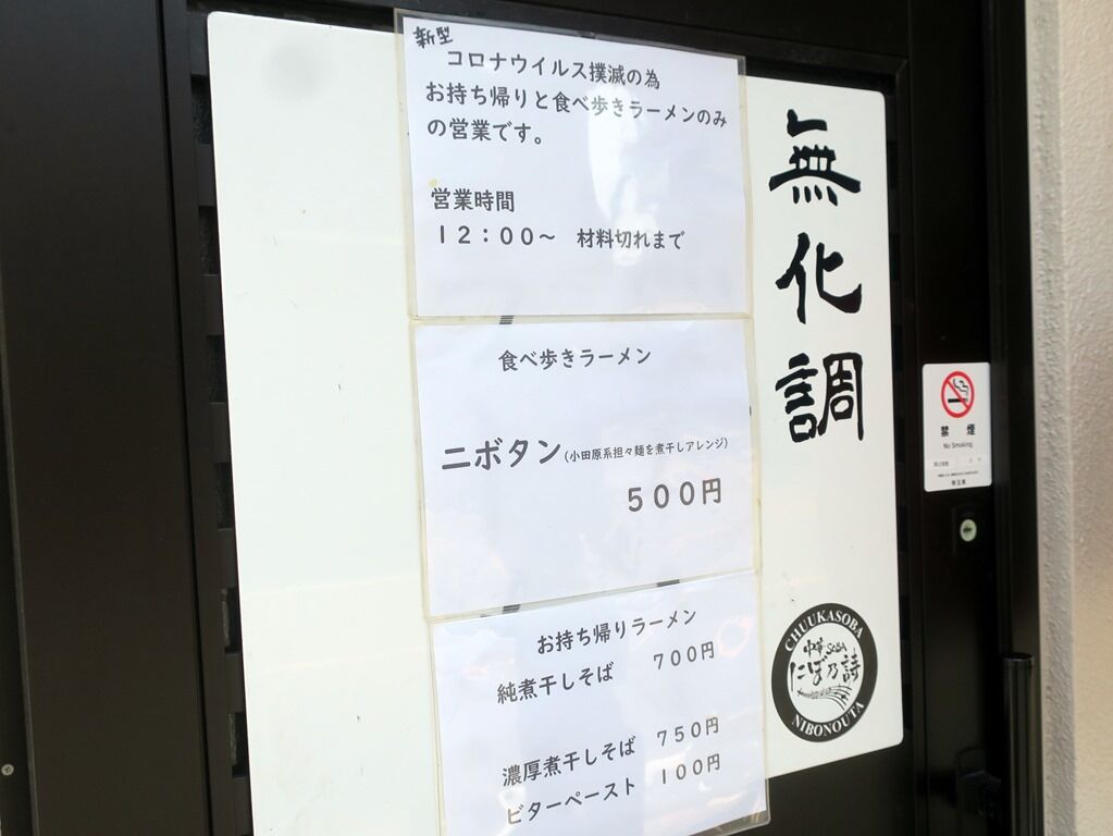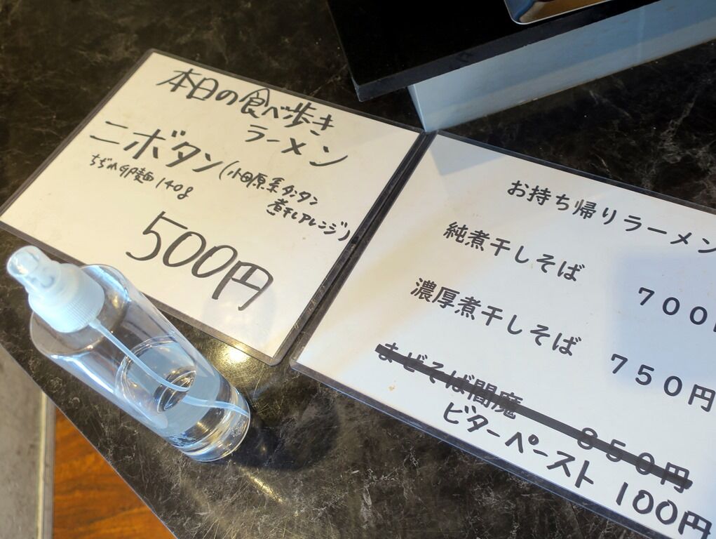 お持ち帰りメニューは、そのまま食べられる「食べ歩きラーメン」のニボタン500円、冷凍スープ・麺の「お持ち帰りラーメン」純煮干しそば700円、濃厚煮干しそば750円、まぜそば閻魔800円(休止中)、ビターペースト100円。注文カウンターにはアルコール除菌液完備。