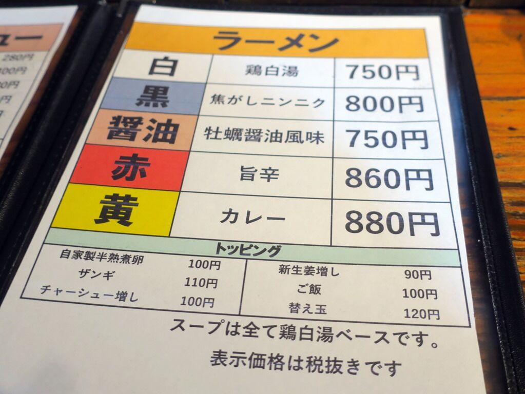 券売機は無く後会計制。主なメニューは、白(鶏白湯)750円、黒(焦がしニンニク)800円、醤油(牡蠣醤油風味)750円、赤(旨辛)860円、カレー880円、他。なお価格は税抜表示。