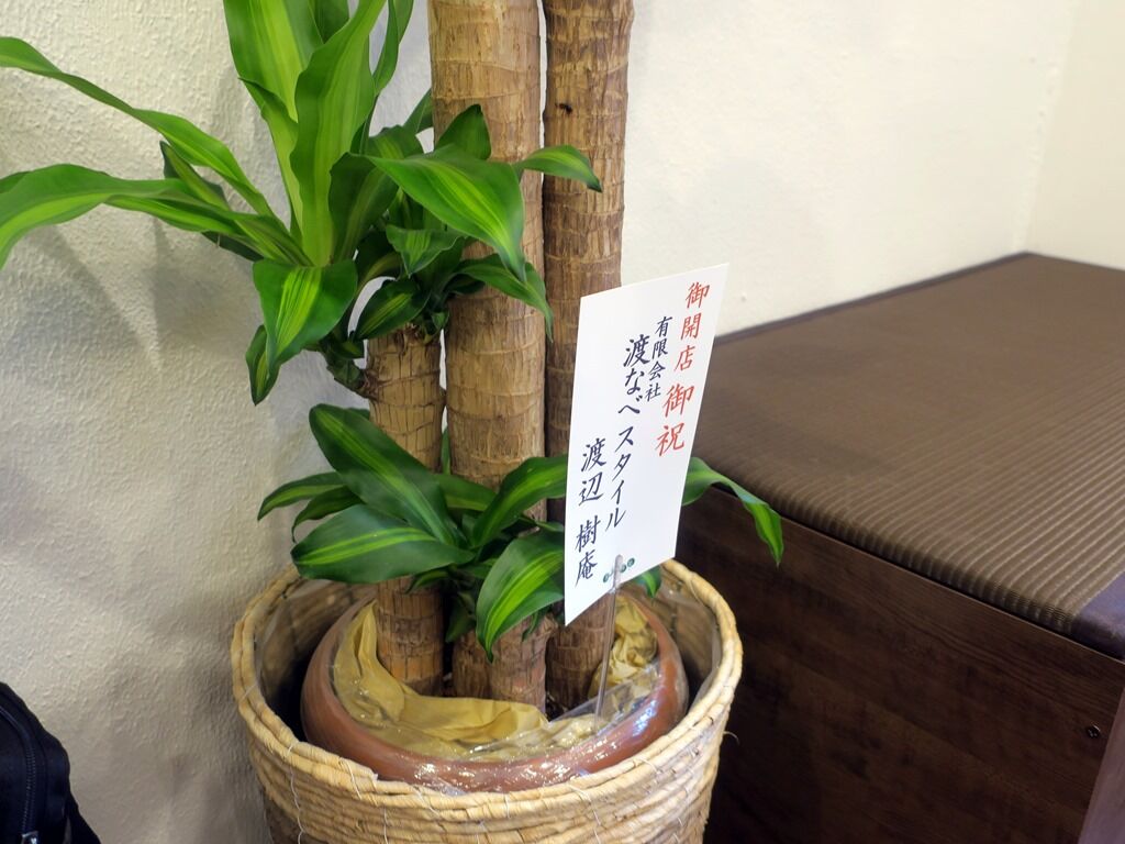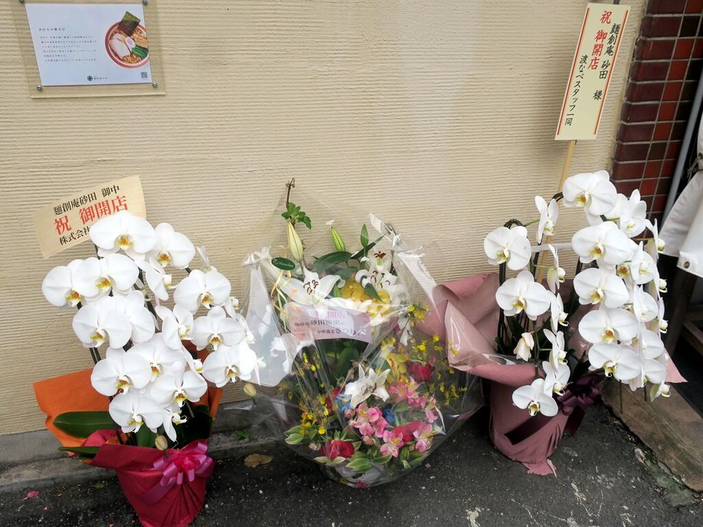 店頭の胡蝶蘭・祝花は渡なべスタッフ一同、女将さんがやはり渡なべで経験された中華蕎麦きつねから。