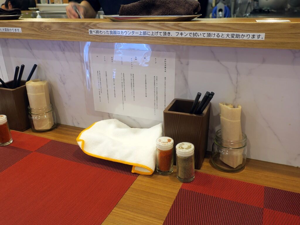 BGMはFM J-WAVE。箸は洗い箸でエコ仕様。卓上調味料は一味唐辛子、ブラックペッパー。