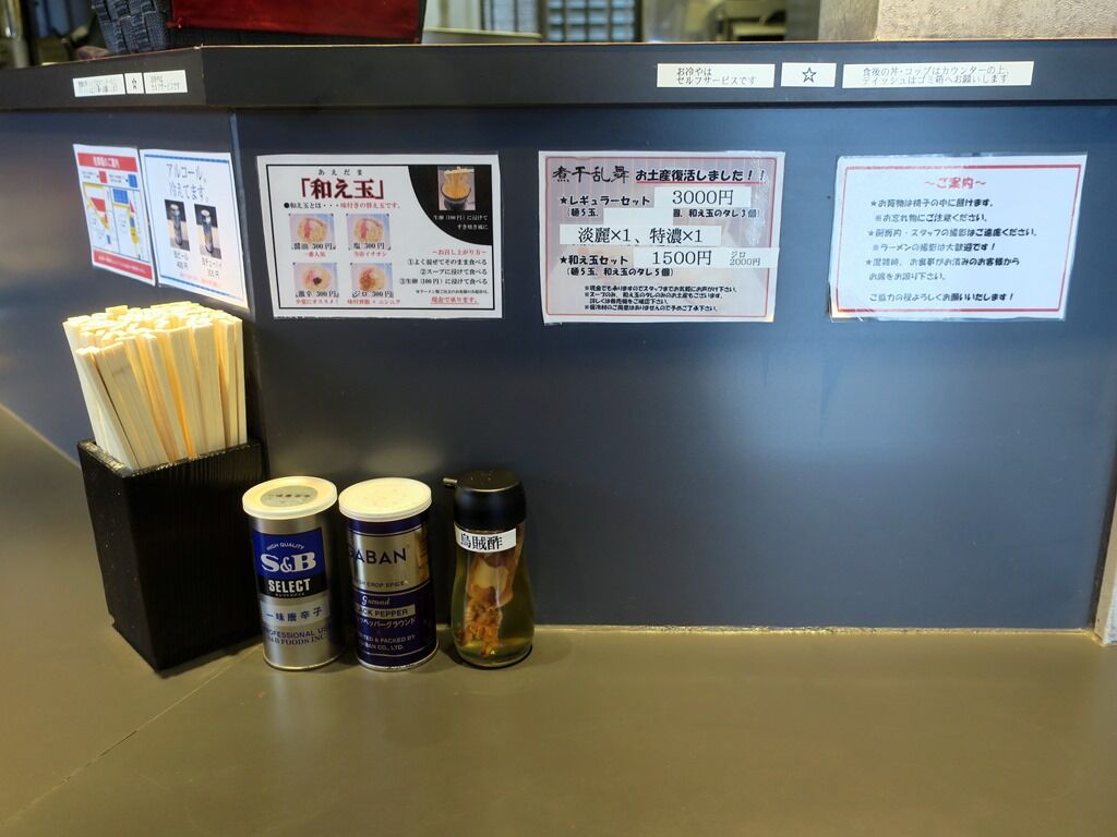 12:00頃到着で先客5、後客2。厨房2オペ体制。店主さん、お久しぶり~!髪を染めて一瞬七彩の坂田さんかと BGMはポップス。箸は割り箸。卓上調味料はS&B一味唐辛子、GABANブラックペッパー、烏賊酢。