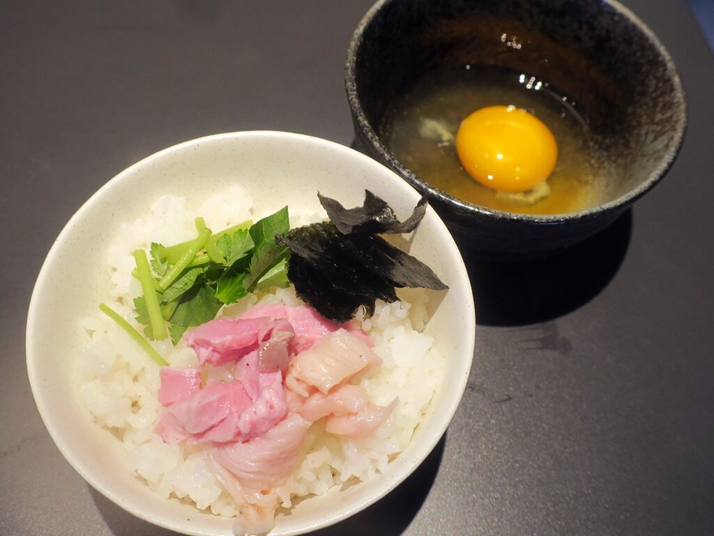 「鯛出汁のTKG」。醤油がなく一瞬どうやって食べれば良いか迷いますが、卵に出汁つゆ入り。TKGとして卵をそのままご飯にかけてマゼマゼ。鯛の風味とうま味が広がるTKGはすごく新鮮!こりゃ驚きの味で凄い、美味しい、感動!