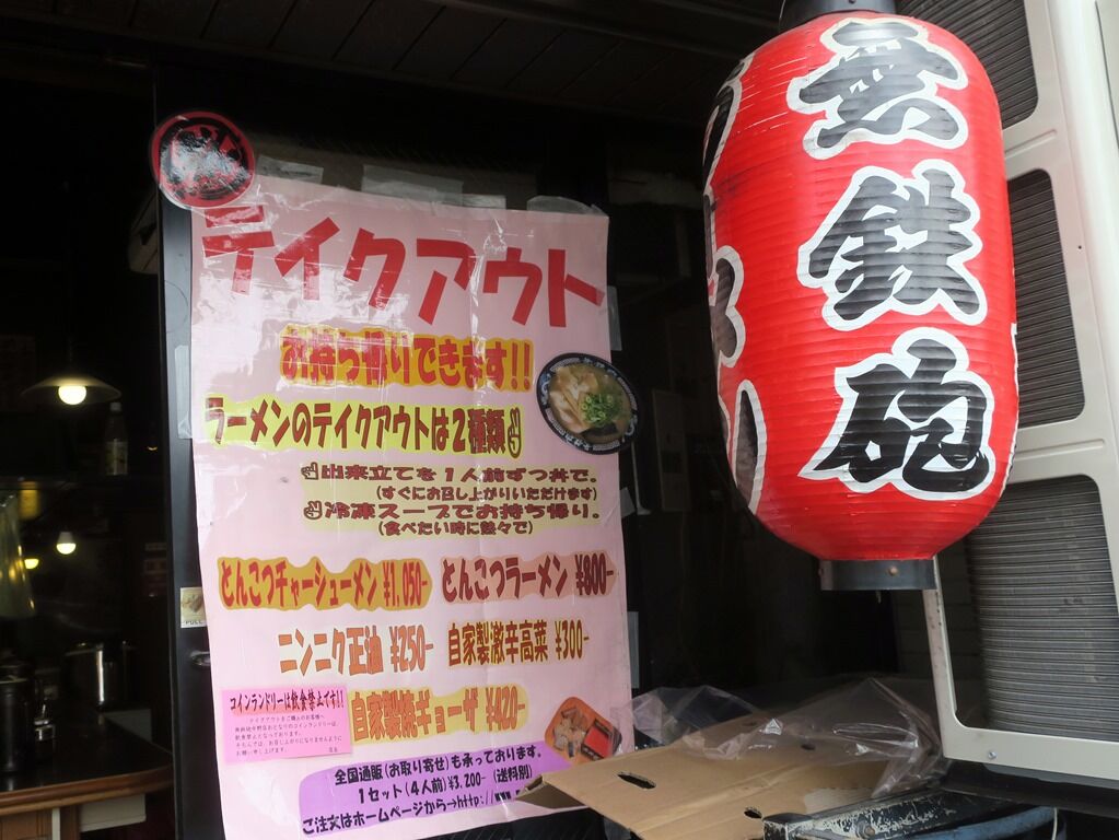 無鉄砲の出来立てお持ち帰りメニューは、とんこつラーメン800円、とんこつチャーシュー麺1050円、ニンニク正油250円、激辛高菜300円。