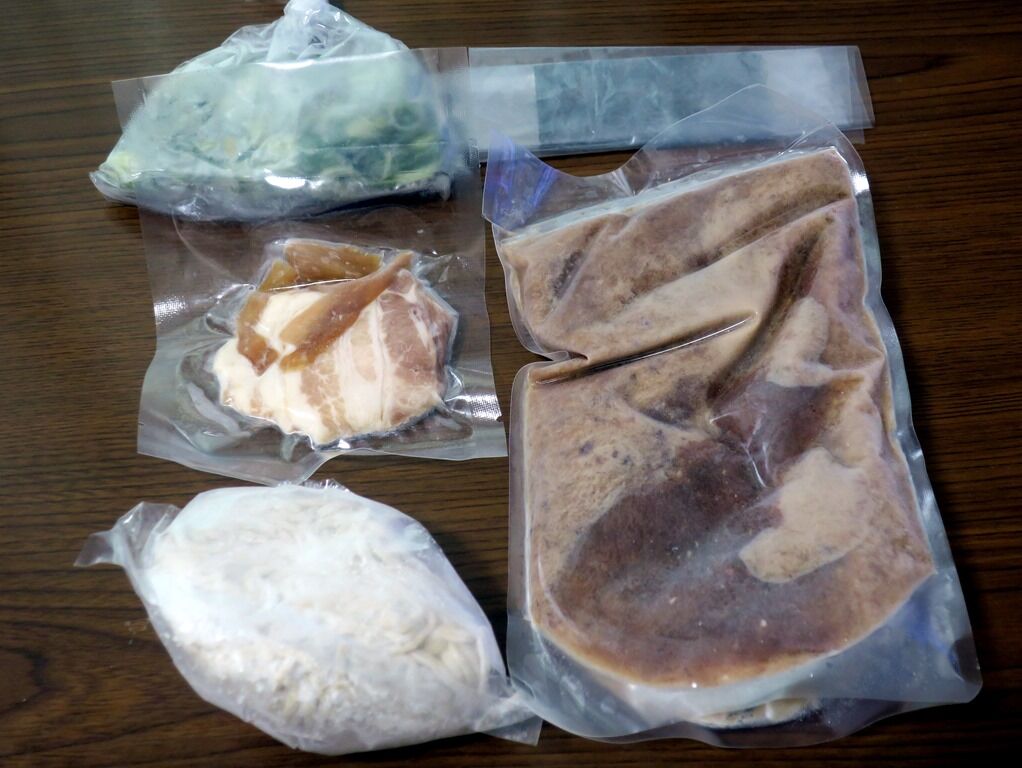 冷凍お土産ラーメンのセット、冷凍スープと麺、チャーシュー・メンマ、九条ねぎ、海苔とトッピング一式付き。
