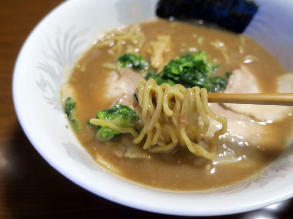 麺は中太縮れタイプ。生麺だったと思いますが帰宅後麺ごと冷凍。凍った状態から沸騰した湯で1分半、ちょうどいい感じでした。プリっぷりの麺で極濃豚スープと良く合います。
