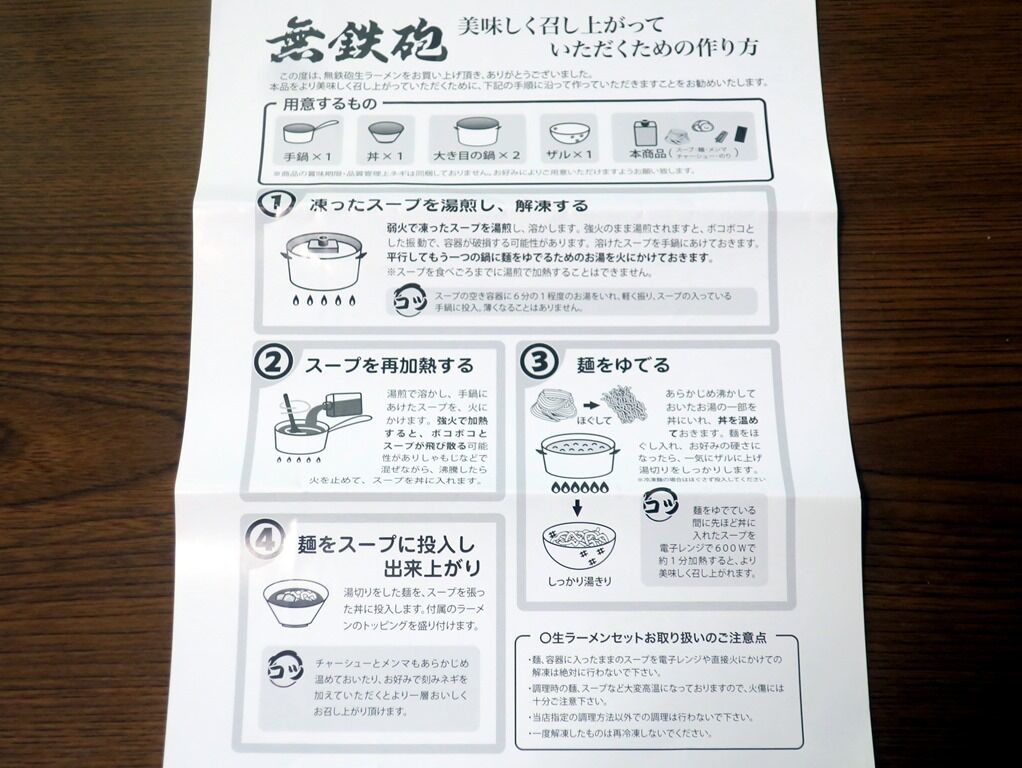 「無鉄砲 美味しく召し上がっていただくための作り方」。スープは湯煎して溶けたら器に入れて電子レンジ600Wの電子レンジで1分加熱。麺のゆで時間は特に指定無く、お好みの固さでとのこと。生麺の通販・テイクアウトをいろ色試してますが、麺のゆで時間の目安が無いのは初めてで、ちょっと不親切。