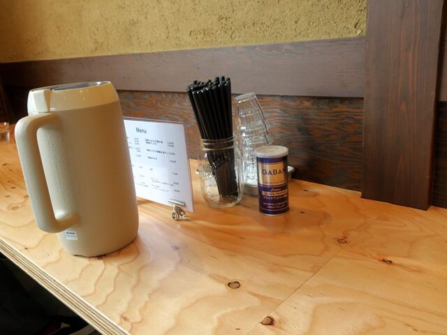 BGMはRATMのナイスなサウンド。箸は洗い箸でエコ仕様。卓上調味料はGABANブラックペッパー。