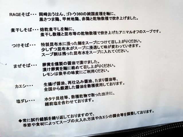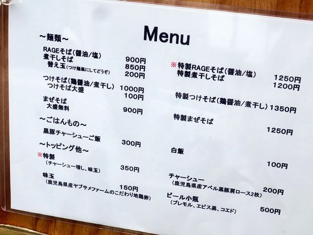 列びが長い場合、待ち中にメニューを渡されてしばらくの後注文を聞かれます。主なメニューは、RAGEそば(醤油・塩)900円、煮干しそば850円、つけそば1000円、まぜそば900円、他。