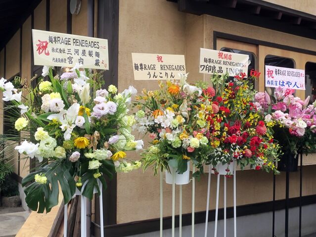 店頭には開店祝花いっぱい。確認できたところでは中華そば四つ葉、三河屋製麺、ゴールデンタイガーから。