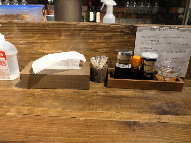 BGMはポップス。卓上手の届く範囲にアルコール消毒液完備。箸は割り箸。卓上調味料は、餃子のタレ、ラー油、GABANブラックペッパー、揚エシャロット。