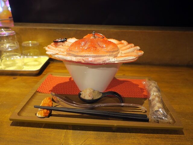 カニの甲羅を模した蓋つきの白い切立丼で着丼。