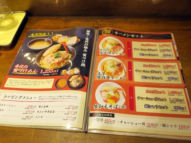 主なメニューは、香住の蟹醤油ラーメン800円、濃厚蟹白湯ラーメン864円、蟹和えそば(冷)864円、香住の蟹つけめん1255円(東京限定)、他。