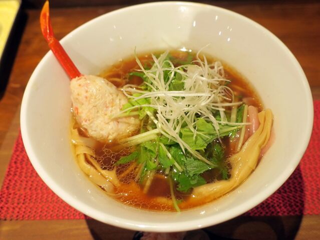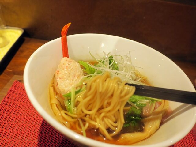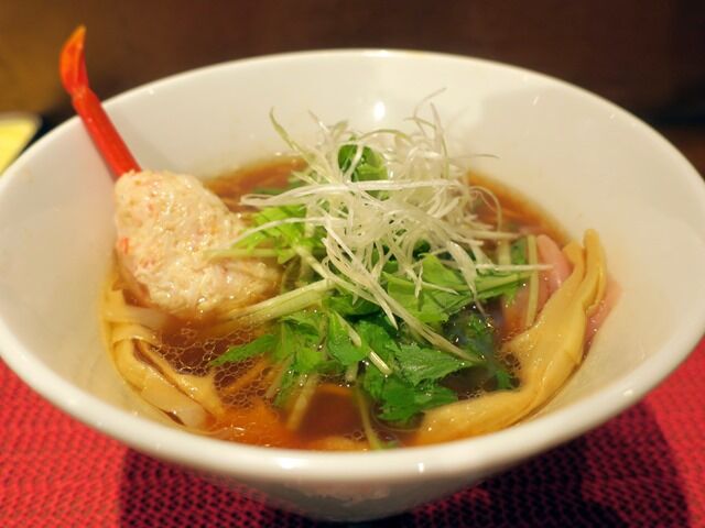 スープはさらさらの清湯醤油味。香住のズワイ蟹と水のみを使ったスープに、タレの醤油には蟹魚醬を使用。仕上げにカニ油。トッピングもさることながら、スープも蟹づくしで、カニをエキスまで堪能出来る一杯。