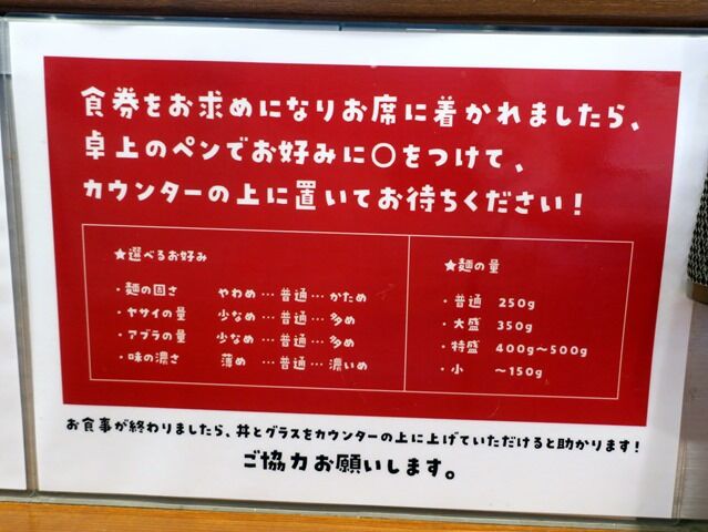 オーダーシートを記載する様にカウンターの掲示にありますが、訪問時は女将さん?が直接ヒアリング。選べるお好みは麺の固さ、ヤサイの量、アブラの量、味の濃さ。