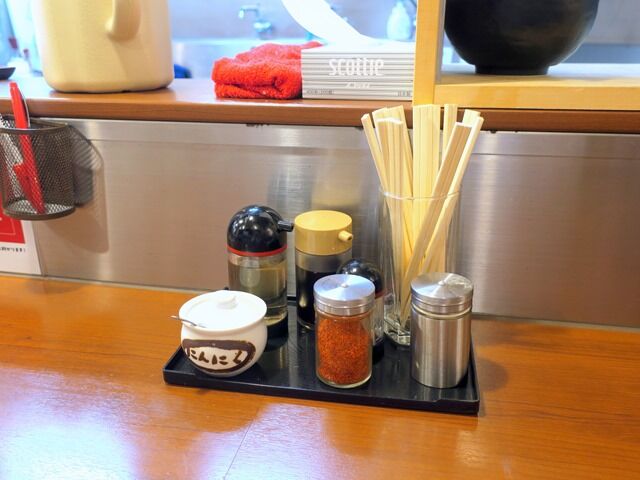 BGMは東京FM。箸は割り箸。卓上調味料・薬味は、醤油、酢、一味唐辛子、おろしにんにく、胡椒。