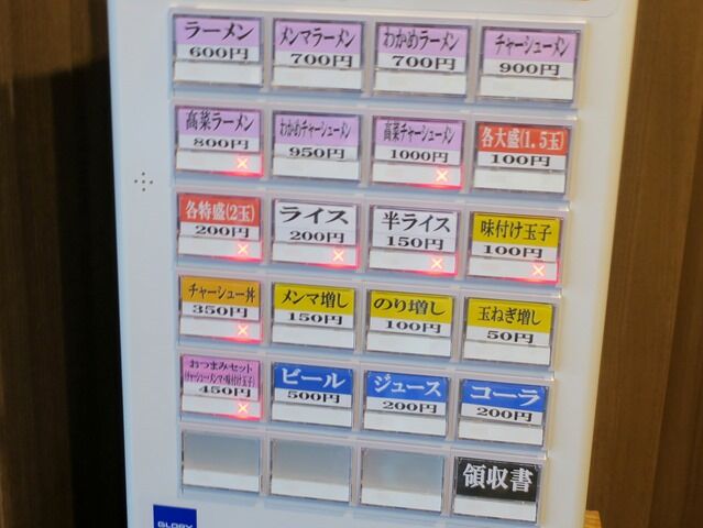 入店するとまず券売機で食券購入です。主なメニューは、ラーメン600円、メンマラーメン700円、わかめラーメン700円、チャーシューメン900円、高菜ラーメン800円、他。