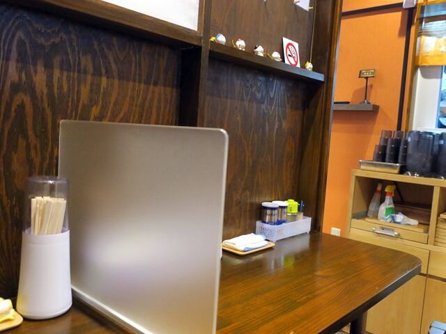 店内は壁に向かったカウンター3席、別な壁カウンター2席、テーブル数卓10席。カウンターは1席ごとに仕切りを設置。12:30頃到着でカウンター3席のみ空き。後客10以上で外待ち発生。