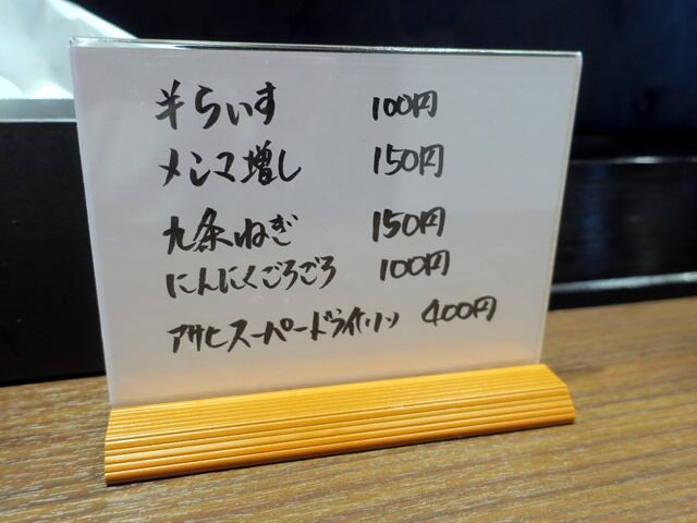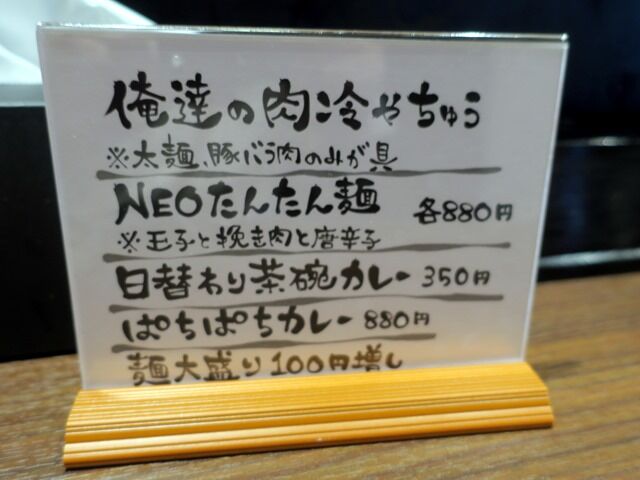 券売機はなく後会計性。主なメニューは俺達の肉冷やちゅう880円、NEOたんたん麺880円、日替り茶碗カレー350円、ぱちぱちカレー880円、他。