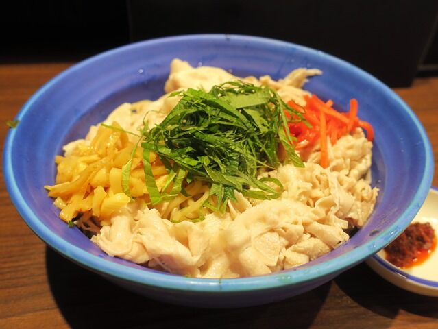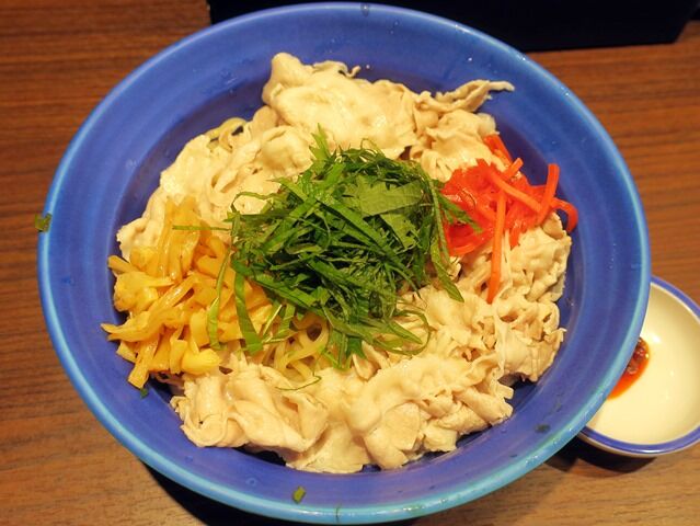 タレ少なめの酸っぱいまんま冷やし中華仕様。きゅうりや錦糸卵も合いそうですが、大量の豚ばら肉がジャンクな個性を演出。麺は浅草開化楼製のストレート中太タイプ。ゆで前200gとボリュームたっぷり。タレを肉と麺にしっかり混ぜて啜ると、さっぱりすっきり爽やかにストロング&パワフルな重量級冷やちゅうが楽しめます。