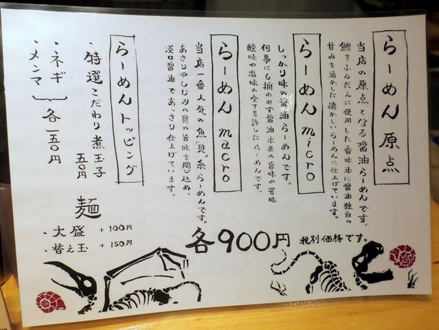 主なメニューは、らーめん原点、らーめんmicro、らーめんmacro 各900円、他。価格は税別表記。