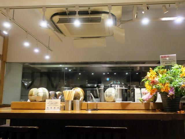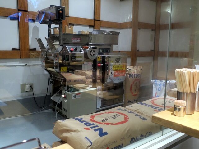 店内は入口は入って右手にガラス張りの広々とした製麺室、真っ直ぐ奥に擦りガラス張りの厨房。