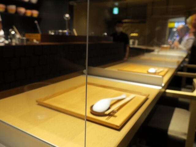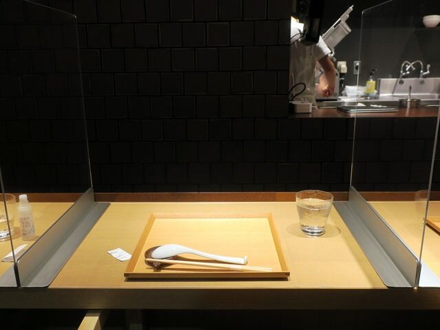 店内は厨房を遠巻きに囲む変形J字型カウンター15席。1席ごとにアクリル版で仕切られています。