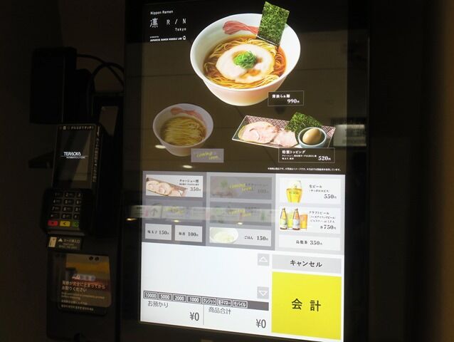 入店前にまずタッチパネル式券売機で食券購入です。主なメニューは、醤油らぁ麺990円、特製トッピング520円、他。