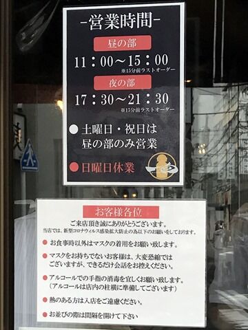 店内は厨房を囲むL字型カウンター9席(3・6)。消毒液は券売機横。カウンター上厨房と客席の間には高い位置ですがビニールシート設置。ただし席間の仕切り板は無し。13:10頃到着で先客8、後客4。入口ドアは開放してますが、席待ちは中に待たせるスタイル。