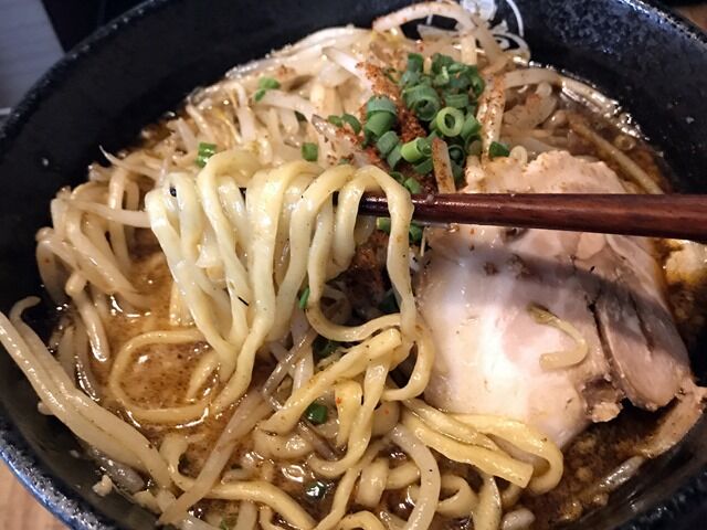 麺は太縮れタイプ。しっかりしっとりゆで上げてあって太麺ですが、モチシコでしっかり啜れます。コクのあるシビ辛スープとがっぷり四つに組み合って豪快でパワフルな一杯が実装されました。