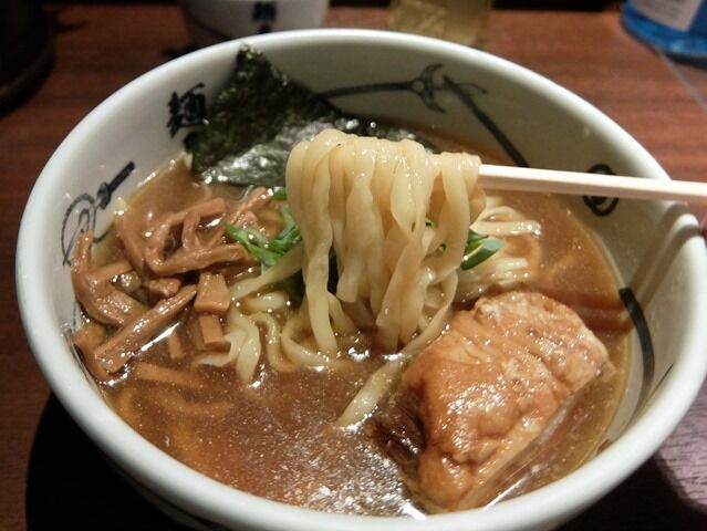 麺は平打ちの太縮れタイプ。うどんのような見た目ですが、超濃密出汁スープとの相性は凄まじく、いったん麺とスープを啜り始めると、ノンストップでレンゲと箸が止まりません。