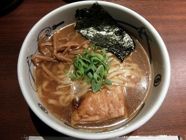 具は武骨発で武蔵各店に広まったでっかい角煮、メンマ、海苔、きざみ青ねぎ。