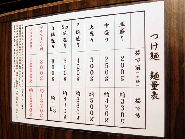 つけ麺は、並盛り200g、中盛り250g、大盛り300g、2倍盛り400g、2.5倍盛り500g、3倍盛り600gまで同料金。
