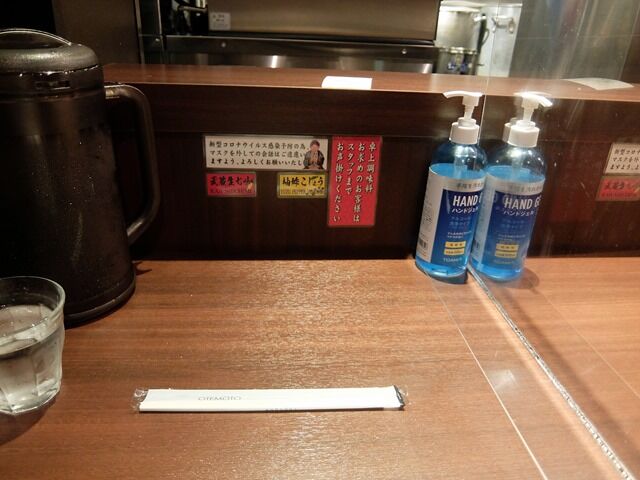 スタッフは男性3名。各席にアルコールジェル配置。