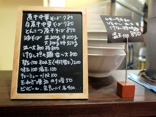 主なメニューは煮干中華そば780円、白煮干中華そば780円、とんこつ煮干そば850円、油そば並~大800円、汁なし担々麺並~大800円、和え玉200円、他。