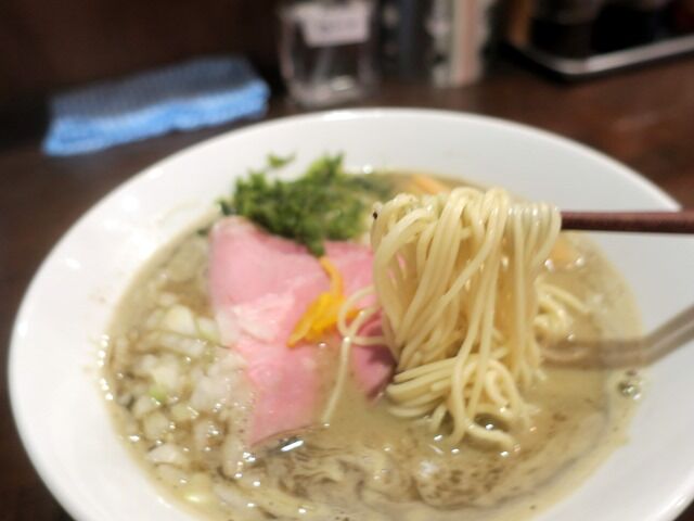 スープは表面が泡立ったとろっととろみのあるセメントカラーの煮干醤油味。煮干出汁と豚骨スープが互いに主張しながら、お互い打ち消すことなく相互に特徴を表出させる稀有なバランス。煮干と豚骨のハーフ&ハーフで双方のいいとこ取り的な面白い構成。ややタレが薄い感じもしましたが、卓上のタレで調整可能。煮干のうま味と豚骨のコクの相乗効果でとっても美味しい!