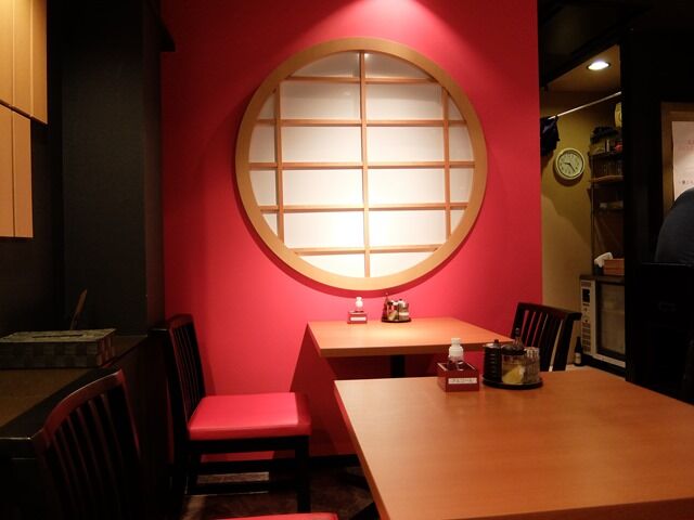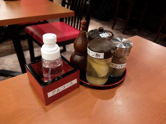 BGMはJ-POP。箸は割り箸。卓上調味料は、一味唐辛子、レモン酢、たれ、ブラックペッパー。