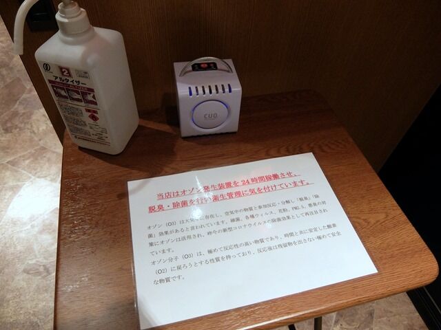 アルコール除菌液は入口と各席に設置。出入口ドアは開放、オゾン発生装置で店内を24時間脱臭・除菌。