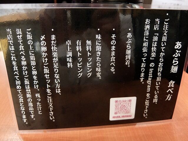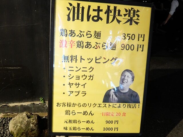 主なメニューは、鶏あぶら麺850円、激辛鶏あぶら麺900円、鶏らーめん900円(1日限定20食)、他。
