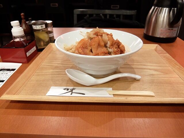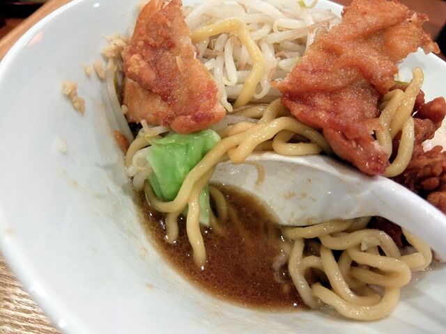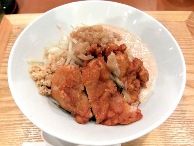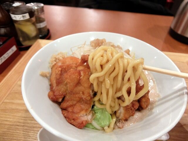 スープというかタレは器の底に少量、うま味の詰まった鶏出汁で、ガッツリ系なのに丁寧な仕事が感じられます。そして、麺の上にクリームソース状の油、麺の上に味付けの固形脂。麺は極太縮れタイプ。しっかりゆでてあって、ワシワシではない適度なコシとむっちり感。
